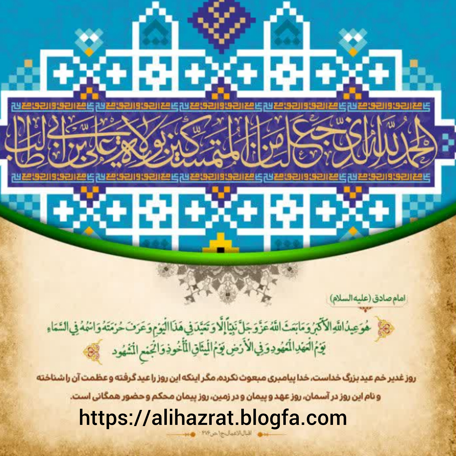 امام صادق (علیه السلام) فرمود: روز غدیر خم عید بزرگ خداست، خدا پیامبرى مبعوث نکرده، مگر اینکه این روز را عید گرفته و عظمت آن را شناخته و نام این روز در آسمان، روز عهد و پیمان و در زمین، روز پیمان محکم و حضور همگانى است. اقبال الاعمال.
